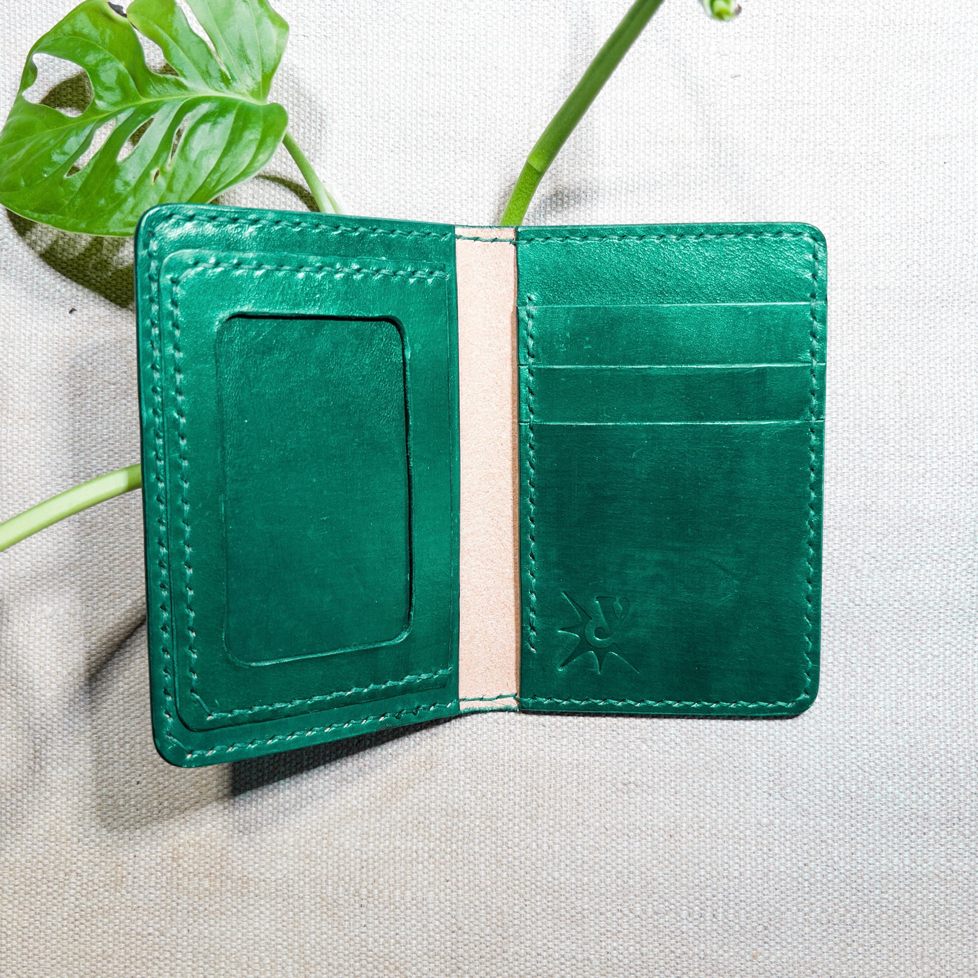 A vertical bifold. Featuring an ID slot on the left with three card slots on the right. Also has two hidden pockets for cash or more cards.