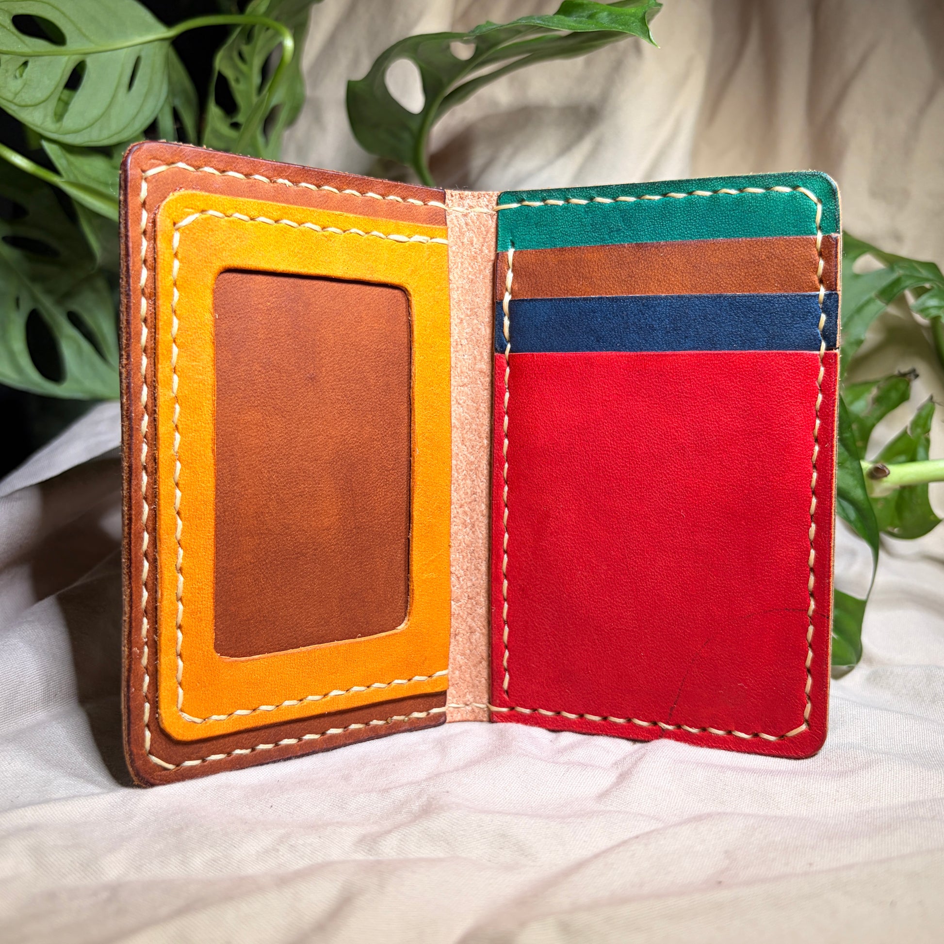 A vertical bifold, with three card slots on the right, an ID compartment on the left, and two hidden pockets for cash.